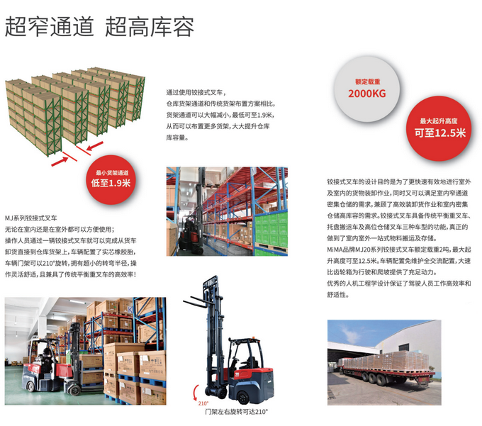 新型鉸接式叉車(擺頭叉車) ,載重2噸,起升最大可達(dá)12.5M,鉸接叉車(擺頭叉車)可以更有效的卸載、處理和存儲(chǔ)貨物,可以在裝卸貨物的同時(shí)將貨物直接帶到室內(nèi)貨架。鉸接式叉車